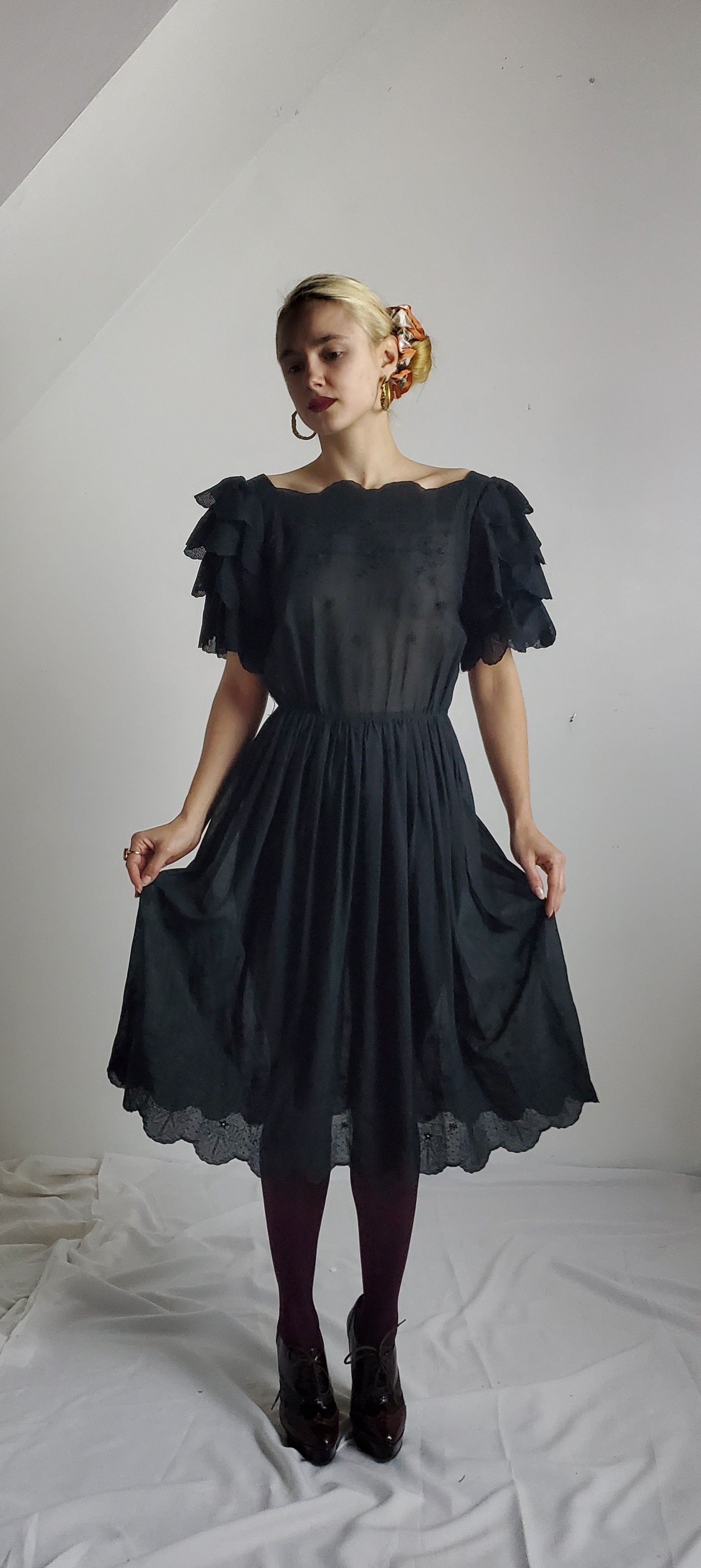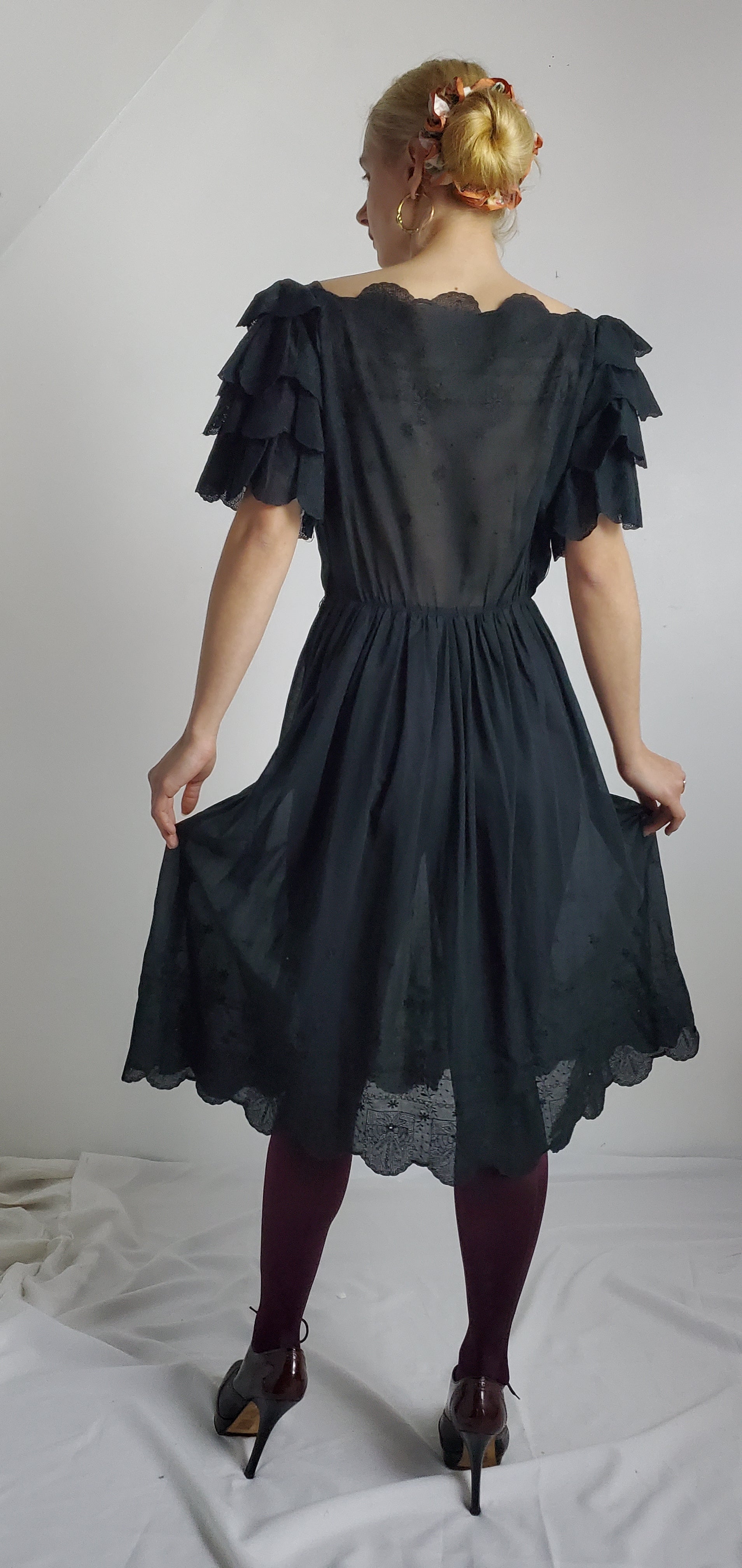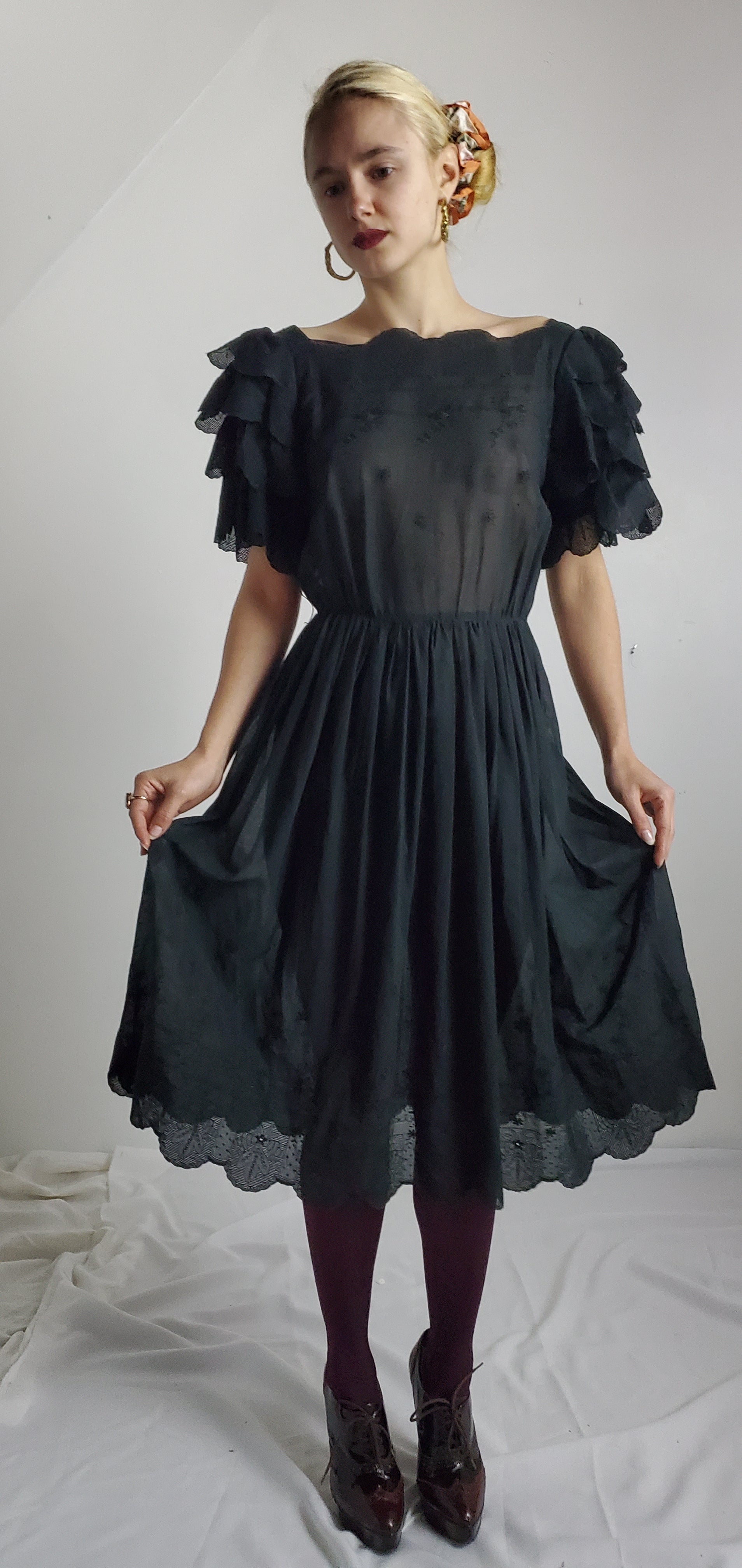 リトル ブラック ドレスですが、1950 年代の綿の夢のような刺繍が施されています