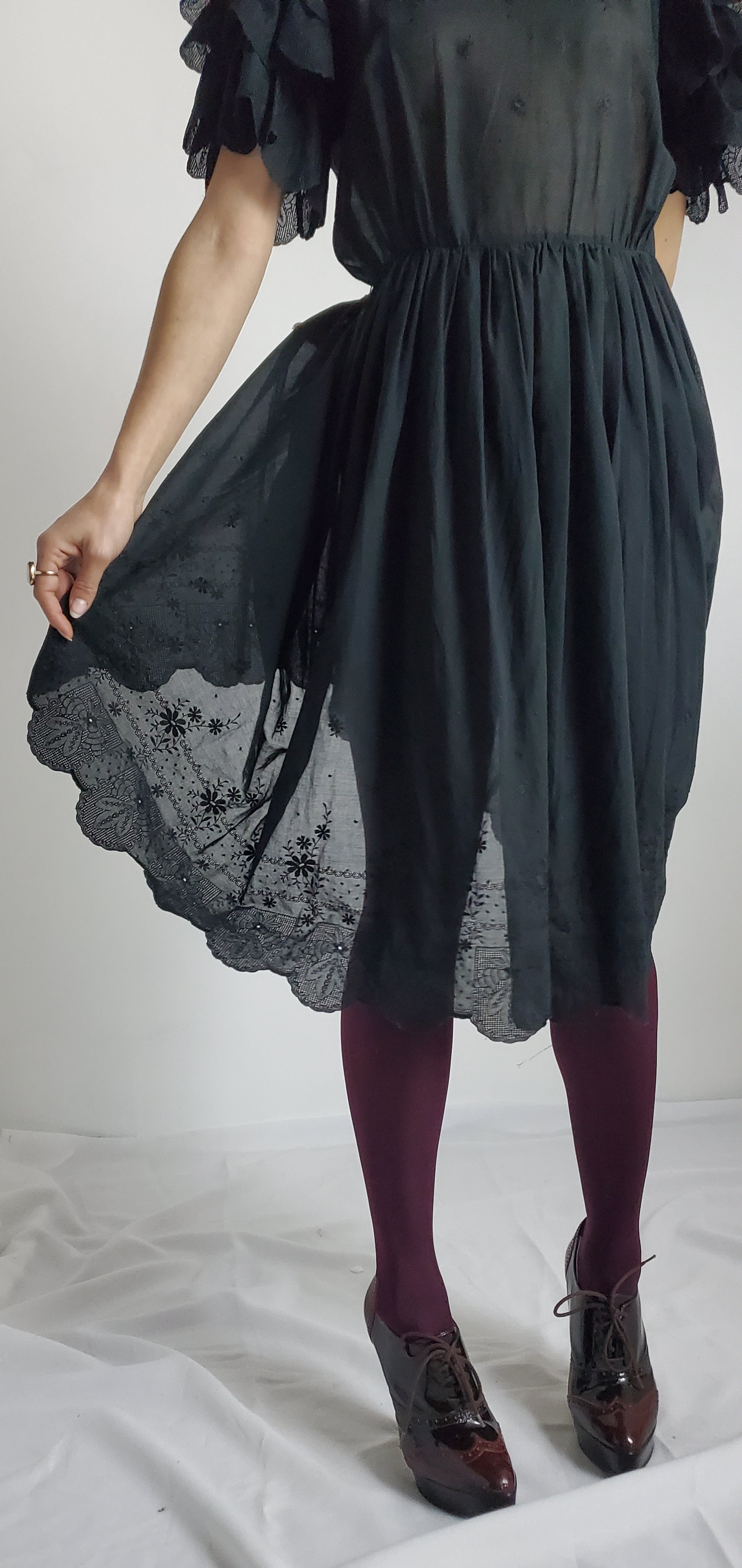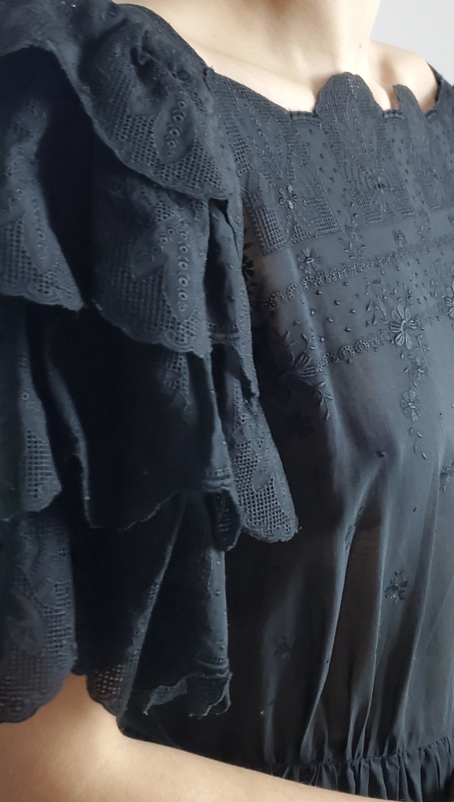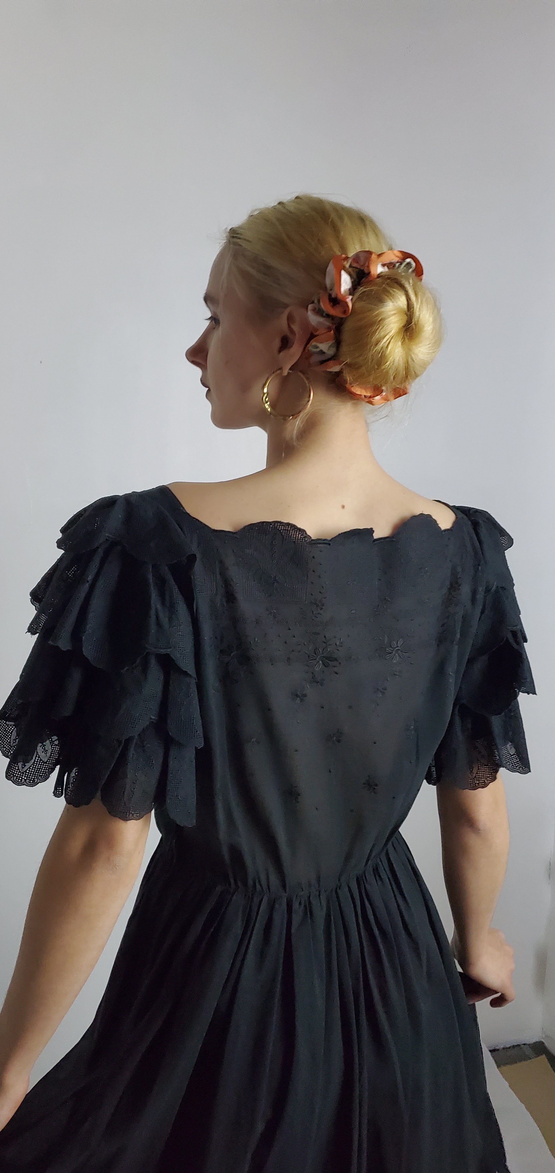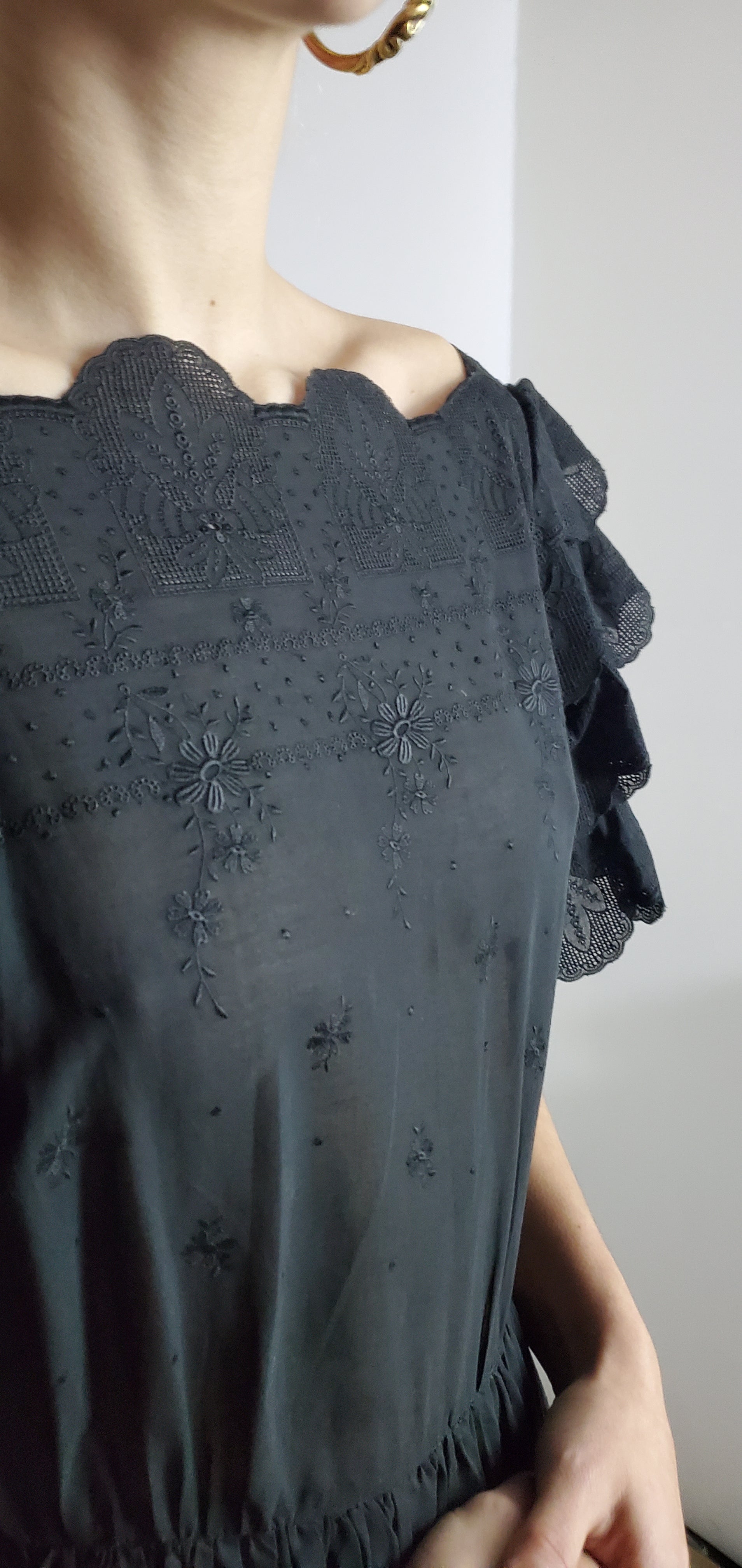 リトル ブラック ドレスですが、1950 年代の綿の夢のような刺繍が施されています